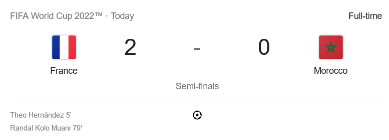حسم المنتخب الفرنسي إلمعركة وحسب التوقعات والخطة المرسومة لمونديال قطر 2022 حجز بطاقته للنهائي في مواجهة الارجنتين بعد فوز باهت بهدفين دون رد على المغرب وهذا الاخير الذي استحوذ على الطابة ولكن دون غلال تذكر فاضاع فرصة العمر في المباراة التي جمعتهما مساء اليوم الأربعاء، في الدور قبل النهائي.